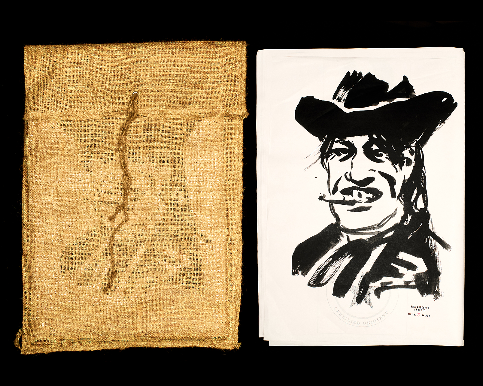 The packaging that envelops the book is as freewheelin’ as its content: a jute bag with the title impressed and numbered by a hip tag for a killing pen. From 1 to 200 – the total and final number of copies.